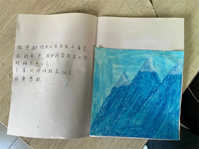 打開這封信,是一封由小朋友自己親手制作的感謝信,信中寫道:“很感謝你在后座上看見我的書包,我和我的同學在車上的時候太開心了,下車時就忘記了,非常感謝。”“很感謝你幫我找到了我的書包,書包對我來說很重要,謝謝。”